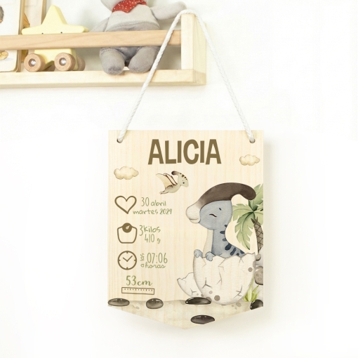 Banderín de madera de pino con temática de dinosaurios, ideal para decorar habitaciones infantiles. Personalizado con el nombre y detalles del nacimiento, su diseño prehistórico añade diversión y estilo a cualquier espacio, convirtiéndolo en un recuerdo inolvidable.