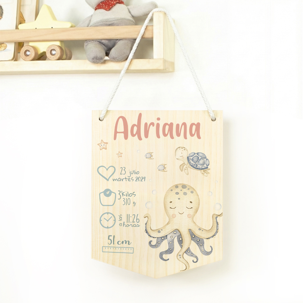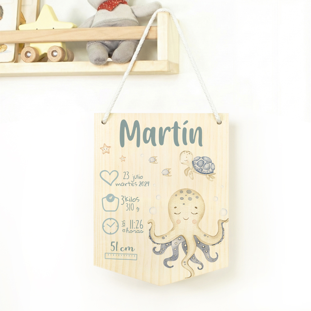 Celebra la llegada de tu recién nacido con nuestro banderín natalicio océano, diseñado con los datos especiales del día de su nacimiento.