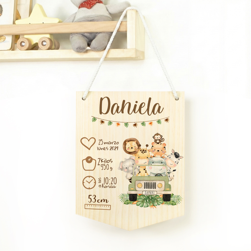 Banderín decorativo infantil en madera de pino con temática de safari. Personalizable con el nombre del bebé y detalles del nacimiento, ideal para crear una decoración única.