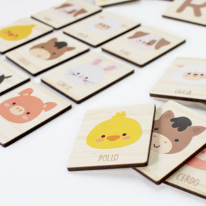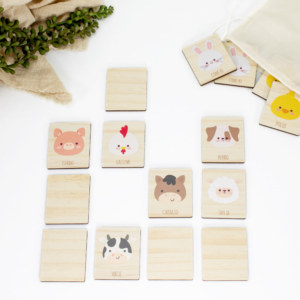 Fabricación: Juego de memoria impreso en madera chapada en pino con diferentes animales de granja. La madera puede contener algunas vetas que crea un efecto muy natural.