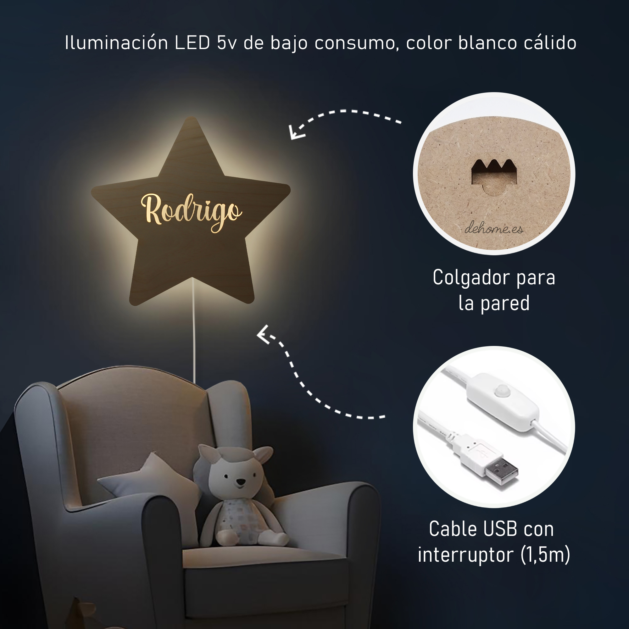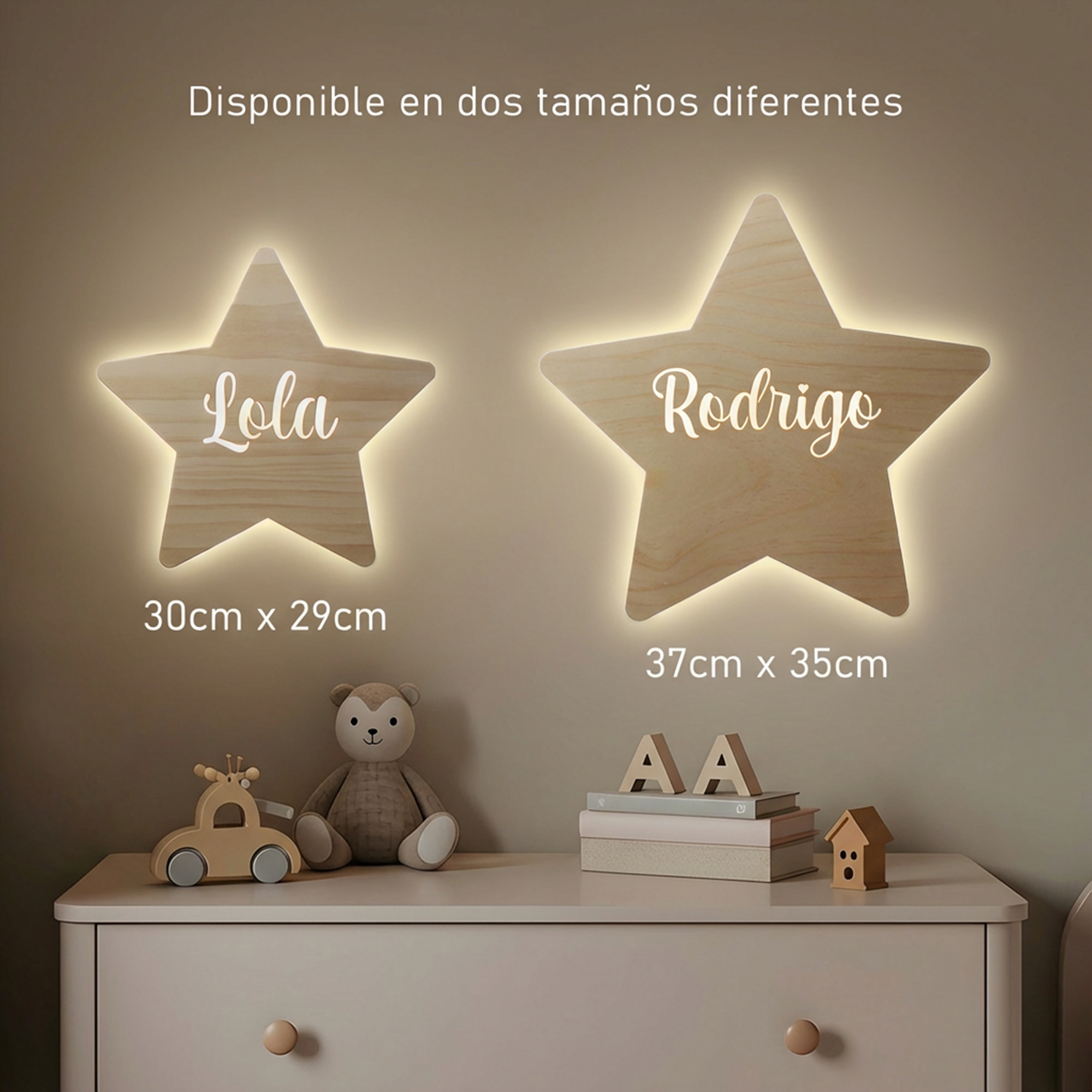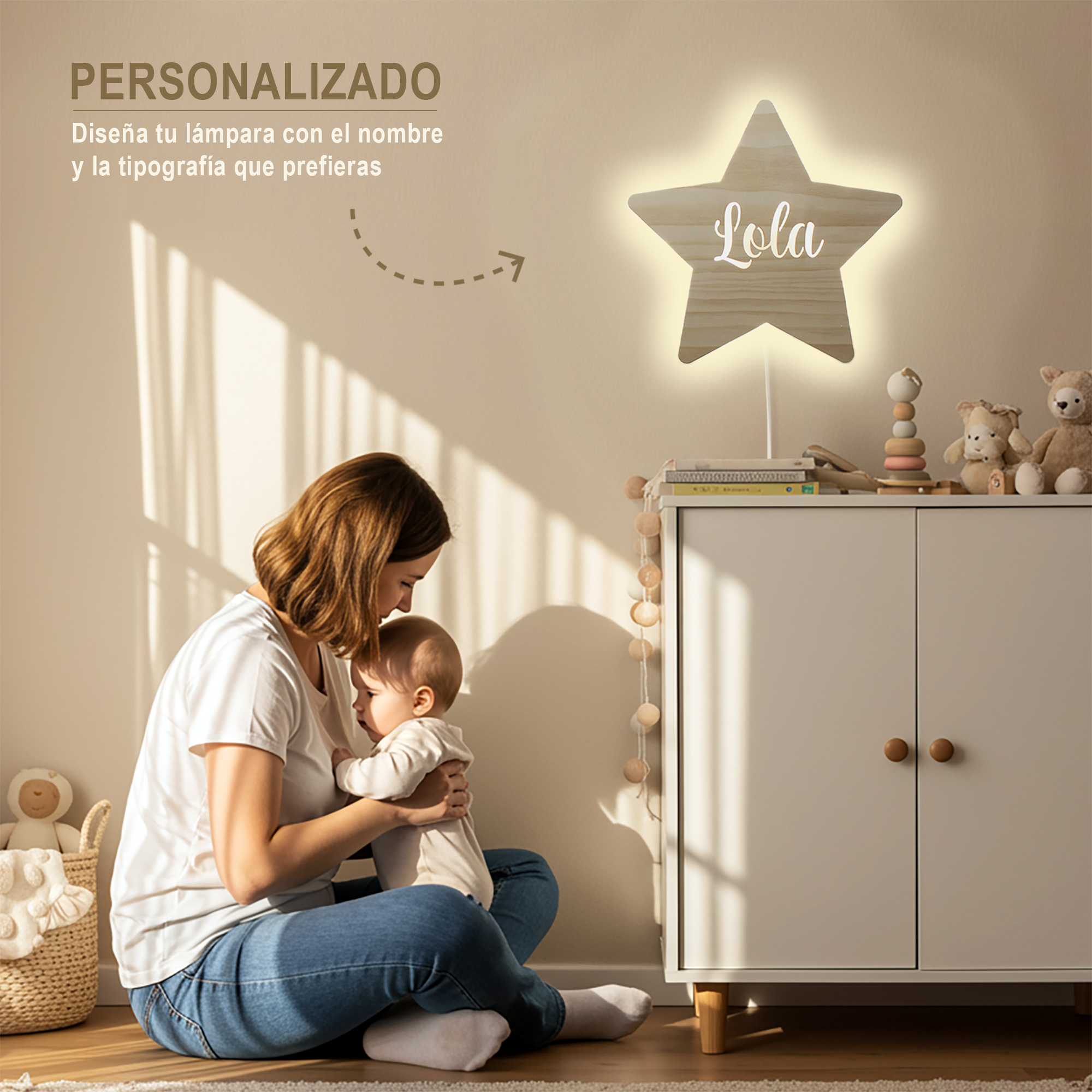 Personalizar el espacio de tu bebé es fácil con nuestra lámpara. Al añadir el nombre del bebé, esta lámpara se convierte en un regalo ideal para los más pequeños. Cada lámpara es fabricada con la máxima atención al detalle, asegurando que no solo sea funcional, sino también estéticamente agradable.
