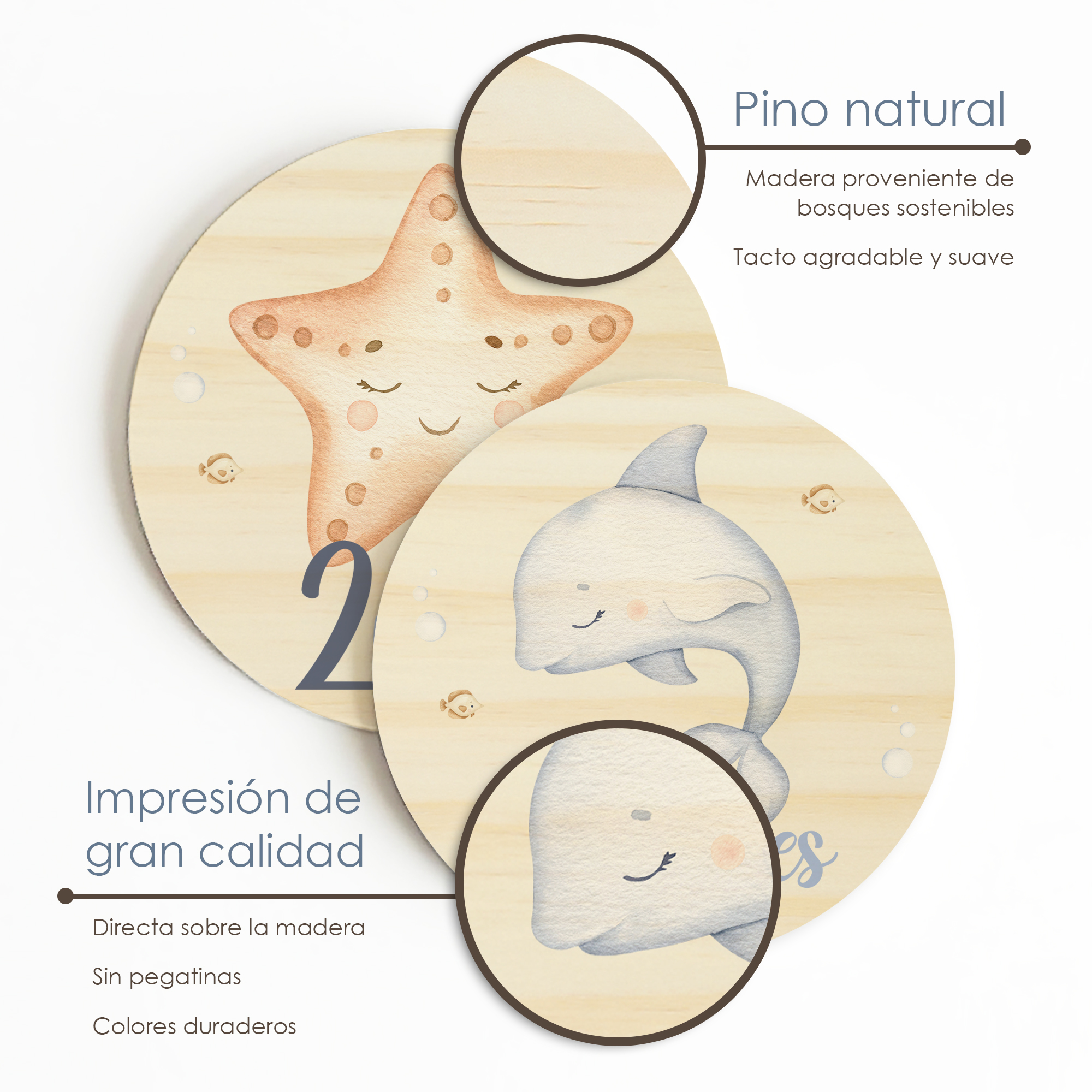 El set cumplemes océano incluye placas de madera decoradas con un diseño delicado y orignal, perfectas para marcar cada mes del primer año de tu bebé. Las placas están hechas de madera de alta calidad. Estas placas no solo son funcionales, sino que también añaden un toque decorativo a las fotografías de tu pequeño, haciendo que cada imagen sea aún más especial.
